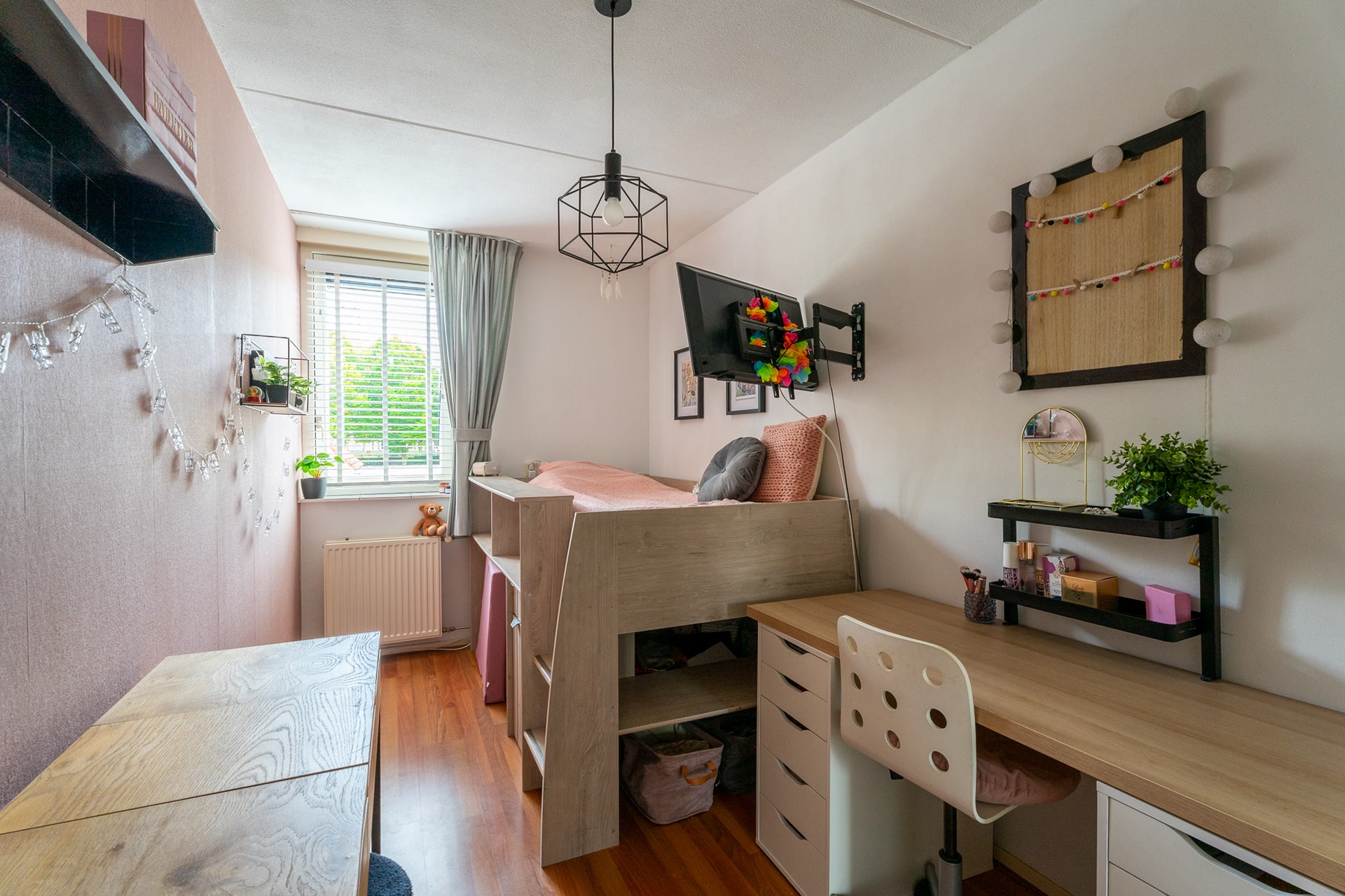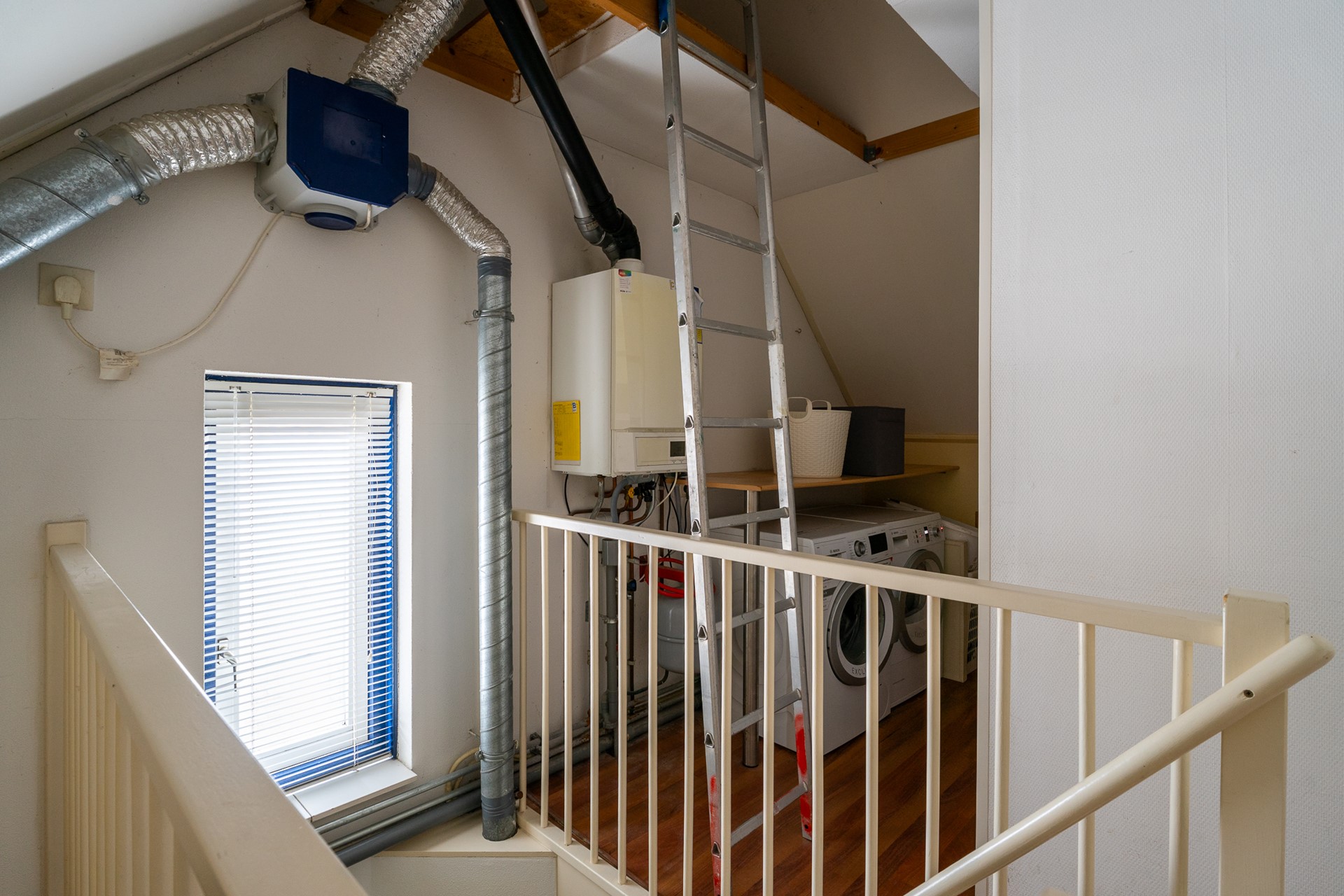 De tweede verdieping is verrassend ruim en ingericht als vierde slaapkamer. Dankzij de slimme indeling en het dakkapel is dit een lichte, veelzijdige ruimte die ook uitstekend dienst kan doen als werkkamer of hobbyruimte. Hier vindt je tevens de aansluitingen voor de wasmachine en droger en extra bergruimte achter de knieschotten.