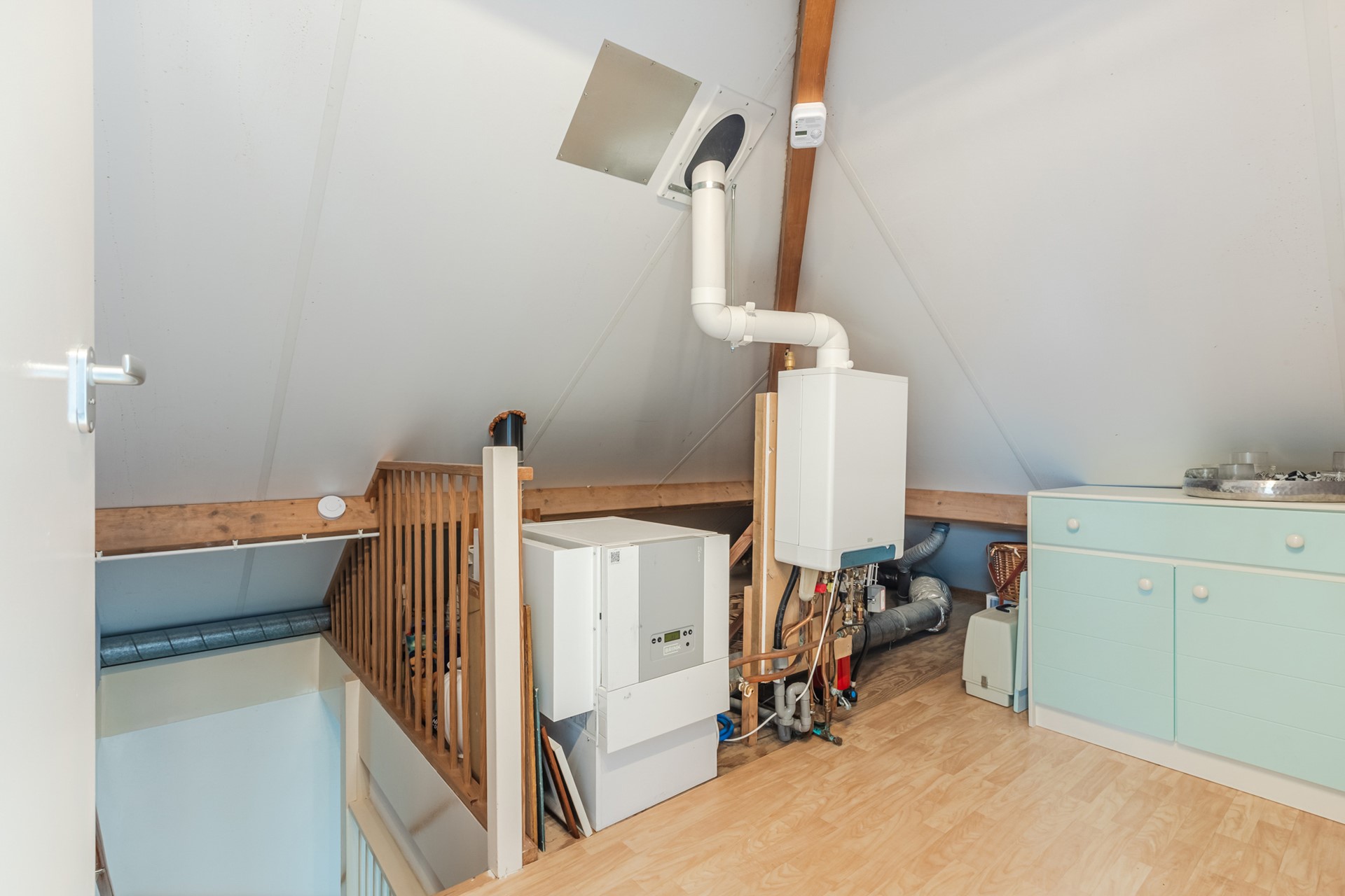 De overloop is voorzien van de opstelling van de cv-ketel en heteluchtverwarming en geeft toegang tot de zolderslaapkamer. Deze kamer is speels ingedeeld en heeft 2 dakramen. Daarnaast is er extra opbergruimte beschikbaar achter de knieschotten.